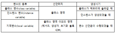 * 필드 - 클래스 변수(static), 인스턴스 변수