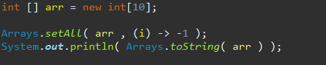 - setAll() : 배열을 채우는데사용할 함수형 인터페이스를 매개변수로 받아 메서드를 호출할 때 함수형 인터페이스를 구현한 객체에 매개변수 또는 람다식으로 지정 해야함.