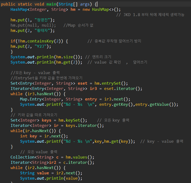 - HashMap = 동기화 처리 X // 새로나온 것이라서 [권장.] key,value - null 허용